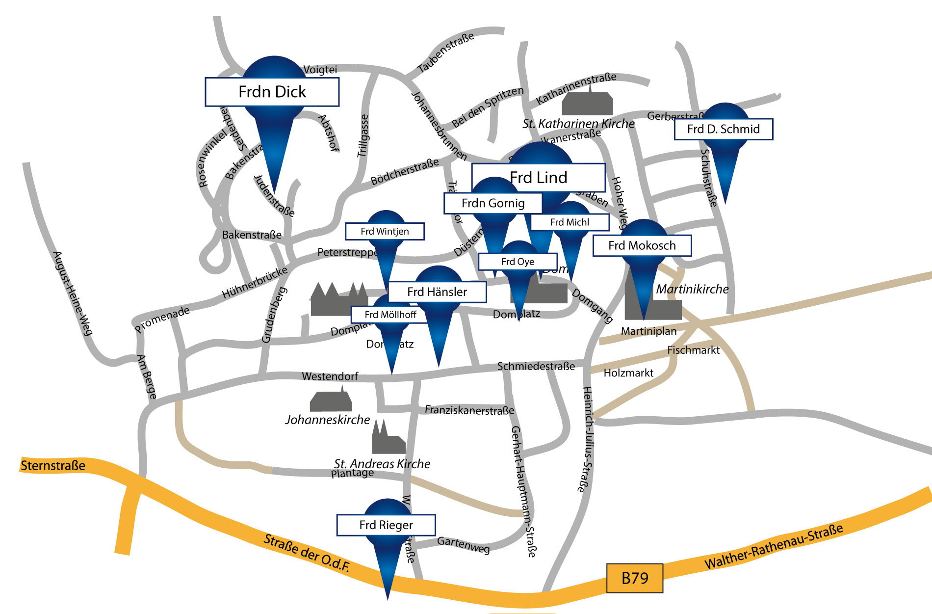 Hier, im ersten Step sehen Sie eine Übersicht von Halberstadt und einige Türen zur Orientierung.